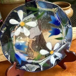 Transperence L’art du verre Quebec transparent decorative art glass plate with ruffled blue edge, white daisies and blue tulips. Very pretty! From a now closed boutique in Quebec.