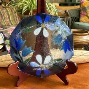 Transperence L’art du verre Quebec ruffled edge floral blue art glass plate.