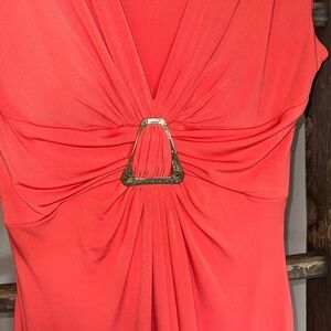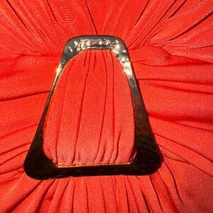 Gorgeous vintage Cache piece! Very interesting silhouette with gold toned metal embellishment. Stretch for comfort and fully lined. Some tiny spots of discoloration and slight piling around embellishment. Discoloration is so slight it isn’t even visible in photos.
