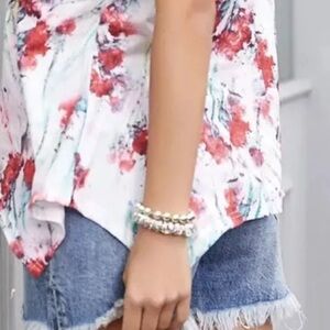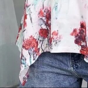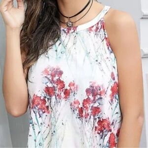 This women’s size large 10-12 Reborn New York halter tank top is white and red floral and has an asymmetrical hem. It is new without tags and chest size 36”-38”.