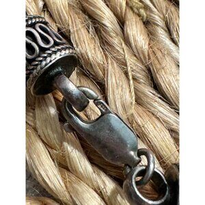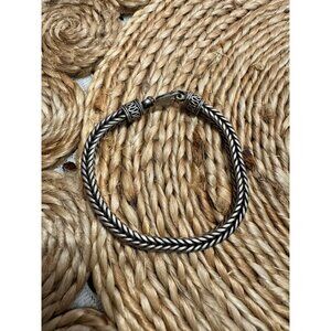 Intricately woven sterling silver with a hook clasp that is stamped 925 BA. It measures approximately 7.5"L end to end and weighs 30g. ConditionAge related wear.