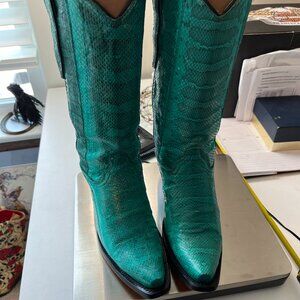 Turquoise genuine reptile size 7 boots. Worn only once to work on carpet. The sole and inside are leather. I've kept these in the box for about two years.