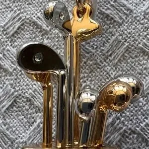 This adorable gem sports both gold and silver tone golf clubs, some adorned with glass stones which also adorn the golf bag, adding a bit of bling for just enough sparkle and shine!!