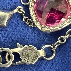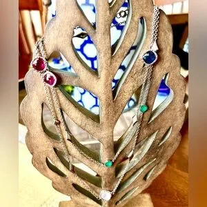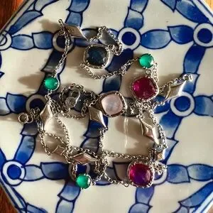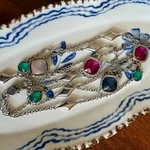 Tacori Faceted Multi-Colored Gemstone & Quartz Station Necklace in 92.5 Sterling Silver and 18K White Gold (stamped) from the City Lights Collection. This necklace is really pretty and is like new. I purchased it a few years ago from a jewelry store in our area (I believe it is now retired as I didn’t see it in stock). Tacori is known for its craftsmanship and design detail. I love this necklace’s design and color combination, but only wore it maybe five times. I have purchased a lot of jewelry on a whim through the years and find myself just storing it away after wearing it a few times. I am now downsizing my collection despite loving all of it. The faceted quartz gemstone colors are so vivid and have a beautiful border design in which the gemstones are prong-set. The color medley includes two dark pink-red, one medium-to-dark blue, three deep Kelly green (gorgeous green which the pics don’t fully capture), and one creamy light pink (I don’t recall the exact names of the gemstones), along with eight diamond-shaped silver accent stations located throughout the necklace. This necklace measures approximately 38” when laid out straight against a yardstick. Looks very nice worn either long or doubled and can be layered with other necklaces. Great Condition!! Comes with the blue Tacori drawstring bag.