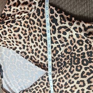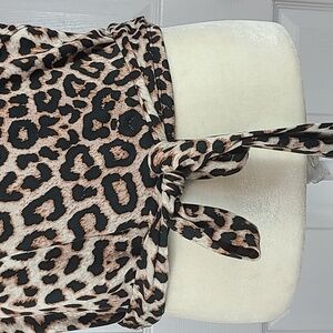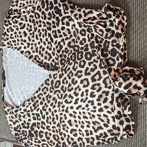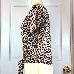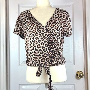 Short Sleeve, V Neck, Crossover Blouse, Slightly Cropped, Ties in Front, Black and Brown Animal Print, Size Extra Large.