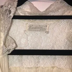 Vintage barbizon 1950s lace lingerie with a small darker colored stain on the front that you can only really see with the flash on. I think the stain is just from old age. I think it says size 5. I really like this piece so if it doesn’t sell I will keep it.