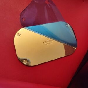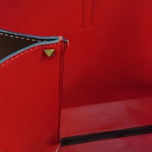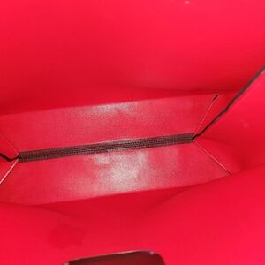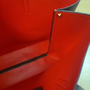 Beautiful Leather Valentino Vring Shopping Tote Bag. This elegant tote bag comes with the signature logo "V" in gold tone and adorned with a ring and leather tie. Double flat leather shoulder straps. The interior is beautiful red leather with signature gold tone rockstuds.