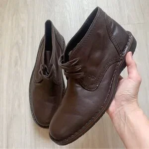 Leather lace up chukka boots with peace sign embossed. Contrast brown piping along the sole. Durable rubber sole for added grip. Slight heel.