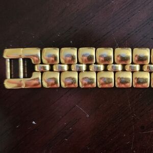 Beautiful brushed gold, 7" end to end. Extra link 1/2" included. The face is 1 1/4", Roman numeral numbers. Stainless steel back.