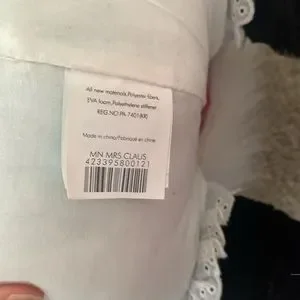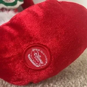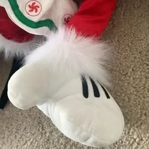 - Minnie wears a red velvet dress ๐ with white furry fur trim turtle neck with a white velvet apron, carrying the theme of Christmas ๐ peppermint candies ๐ฌ ๐ญ, green thread ๐ชก๐งต stitching and white furry fur trim