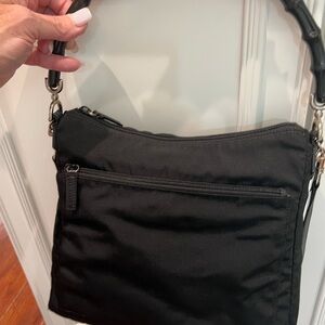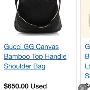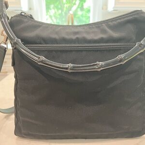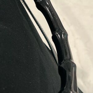 Black Gucci canvas bamboo top handle with removable leather strap.
