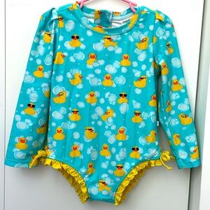 Posh Peanut Girl's Long Sleeve Ruffled Rash Guard Swimsuit - Ducky - size 5T