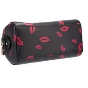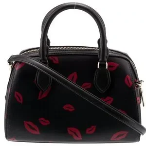 This Kate Spade Madison Small Lip Toss Printed Leather Duffle Crossbody Bag is a versatile accessory for any occasion. With a rectangular shape and matte finish, this bag features a zip closure and double handles with a 3" drop. The bag is made of black leather with gold tone hardware, and the strap is detachable and adjustable with a drop of 9 inches.