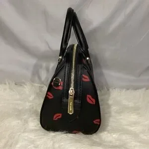 The bag has a small size with a width of 9 inches (on bottom), a height of 6.5 inches, and a depth of 4 inches (on bottom). It also has inner pockets and is lined with red fabric. The bag is part of the Madison Lip Toss Printed collection and is perfect for business, casual outings, parties, travel, and weddings.
