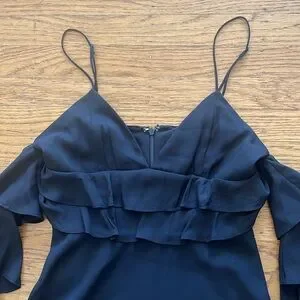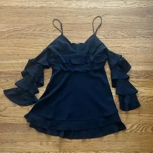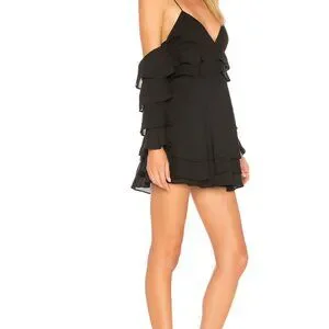100% polyLining: 93% poly, 7% spandex. Hand wash cold. Fully lined. Shoulder cut-outs. Tiered ruffle overlay. Adjustable shoulder straps. Hidden back zipper closure. Revolve Style No. NBDR-WD1125.