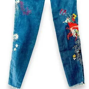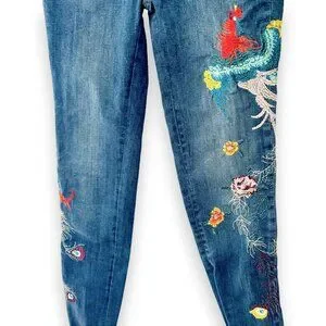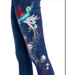 - Denim, embroidered, floral, cropped, skinny, dark-wash, frayed, high-rise, bohemian, multicolor