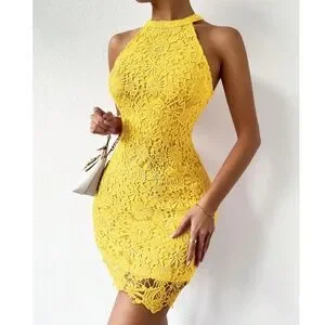 Boho Yellow Floral Lace Halter Mini Dress