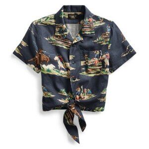 Keywords: Ralph Lauren, Western print shirt, vintage-inspired, linen blend, camp shirt, cropped fit, timeworn look, rodeo design, luxury casual, designer shirt.