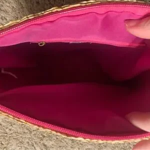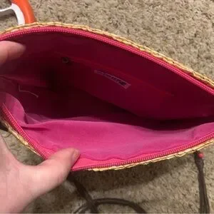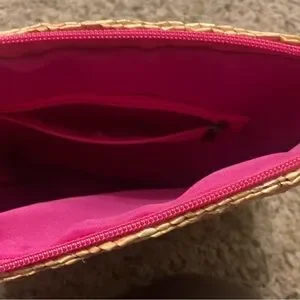 NWT Cruise Club pink/tan striped summer/spring straw crossbody with corded/beaded strap & zip closure
