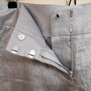 Dazzling metallic shorts from luxury designer brand Vince Camuto. Perfect for a fabulous poolside cocktail party. 100% linen. Medium gray with silver weave (color 071 "Vapor"). Wide waist band with double hook and button closure and front zipper. 4 functional pockets, 2 front pockets and 2 back pockets (still sewn shut).