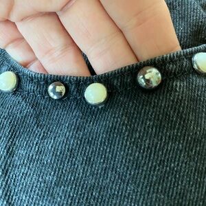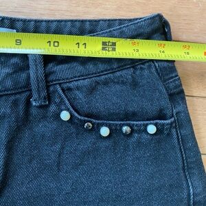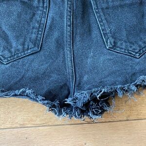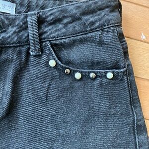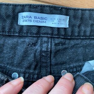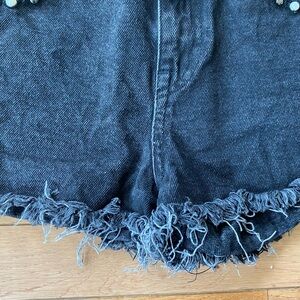 These are in like new condition! These Zara denim shortie shorts are a black faded denim color . Frayed hem. Has detailing of beads top of pockets and around the top of the back of the shorts . These are a great pair of denim shorts some stretch to them ! Measurements in the photos