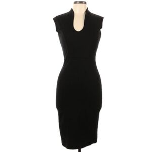 Sleeveless, open neckline, bodycon silhouette, solid, embossed, fold over fabric, piping, zipper detail, ribbed, cut outs, black, classic, midi-calf length.