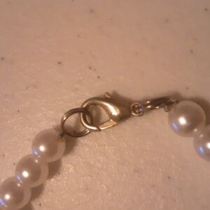 about 6.5" long with lobster claw closure, white faux pearl, good pre-owned condition. pet friendly non smoking home
