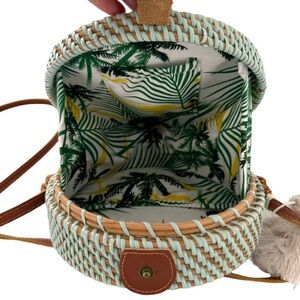 This beautiful and unique hand-woven round bag is a must-have accessory for any stylish woman. The bag features a brown leather strap that can be worn across the body, making it perfect for any occasion. The exterior is made of rattan straw wicker and cloth, while the interior is lined with high-quality leather