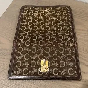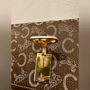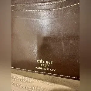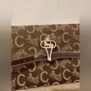 Beautiful Celine wallet with metal carriage clasp. Has 1 card slot, 2 slip pockets and 1 interior snap pocket. Vintage item has minor edge wear and minor rubs on the exterior canvas.