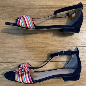 NWOT - ANTHROPOLOGIE “Elenore” Navy Blue Suede T-Strap Sandals with Bows / Sz 9