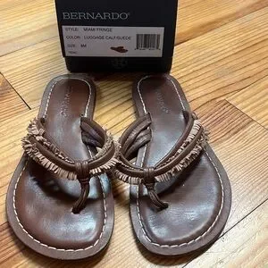 Gently worn, in the box, Bernardo Miami Fringe sandal. Luggage brown leather with suede fringe. Size 8