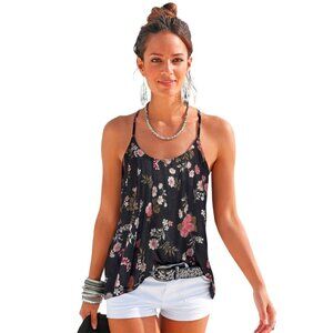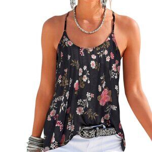 Unleash the epitome of summer elegance with our Black Floral Spaghetti Straps Strappy Back Tank Top. Crafted for the modern fashionista, this top is a symphony of design and comfort made from a premium blend of 95% Polyester and 5% Elastane. Its sleeveless cut allows you to bask in the warmth of the sun while the captivating floral pattern blooms across the fabric, offering a graceful and charming addition to your seasonal wardrobe.