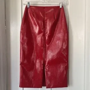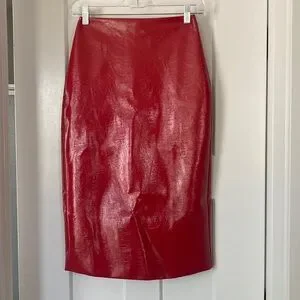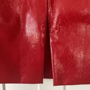 Beautiful Imitation Leather Skirt, Red, lined, from pet and smoke free house .Waist is about-26”around,length is about-28”, zipper on back -about 6.5”, slit on back is about-10”, about 18”In hips area on back