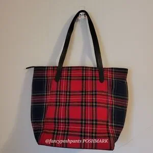 J JILL GENUINE LEATHER trim 100% cotton plaid NWOT zipper, interior pocket tote bag