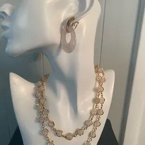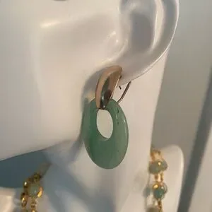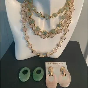 Vintage rose quartz & jade green oval door knocker earrings. Omega back, interchangeable stones, jade green & rose quartz with matching necklaces. Pink quartz necklace is approximately 32” total length does not have clasp, jade green 31” total length, has clasp.