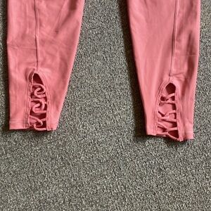 Coral color NWT crop leggings. True pockets on both sides! Cut out/ crossed detail on back bottom of each leg.