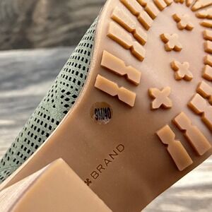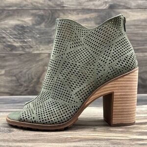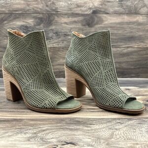 NIB Lucky Brand Vacob 9M Open Toe Perforated Block Heel Ankle Bootie Olive Suede