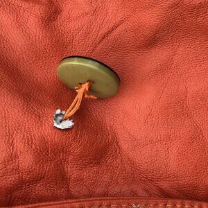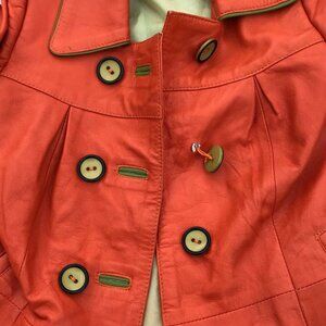 Wonderful rare kids Bennys place made in Turkey all leather and silk great retro designer styling orange and green with black inside silk has stain by extra button as well as one button is loose. A few pin sized spots where leather has damage I am not positive on the sizing so please see all measurements this is an adorable coat I could not find another similar the sizing tag says 1