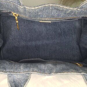Exterior Condition: Perfectly distressed denim, minor corner and handle fading, stain on bottom-side of handle, shiny hardware