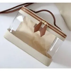 Pack this matching trunk as a chic alternative to storing all your makeup and accessory needs. Canvas with vegan leather accents and clear lining 14 cm × 9.75 cm x 21.5 cm