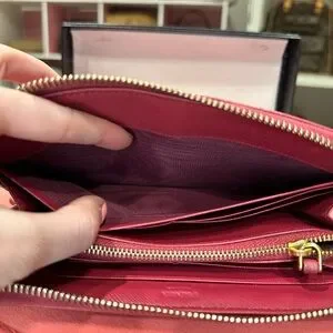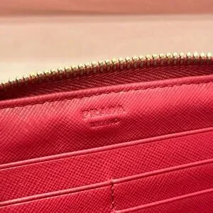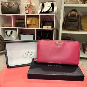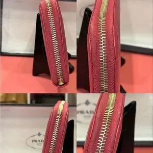 This saffiano leather wallet is decorated with Prada lettering. The all around zipper opens to plenty of card slots, slip compartments, and a coin compartment.