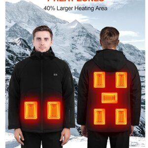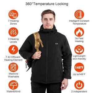 7 HEATING ZONES - 40% LARGER HEATING AREAS: The heated jacket for men are equipped with 7 carbon fiber heating zones,Heat across body (left & right belly, shoulder, mid-back, loin ). Warm your body up within 3 seconds. Perfect for all fall and winter outdoor activities, including walking your dog, hiking, motorcycle, skiing, skating, hiking, fishing, camping, hunting or just your everyday commute.