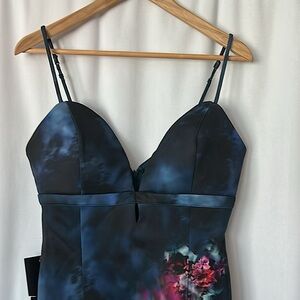 Super Sexy NWT Bebe Amanda Print Dark Blue Spaghetti Straps Scuba Mini Dress. Size M.