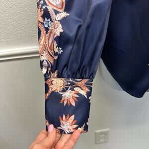 Details: Beautiful paisley pattern with a navy base color, cuffed sleeves, fabric buttons & collared neck in a size medium.