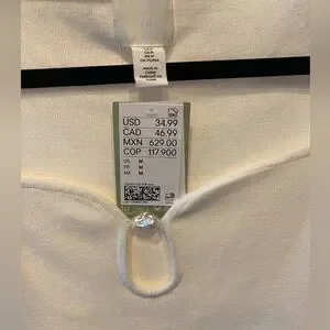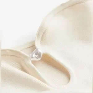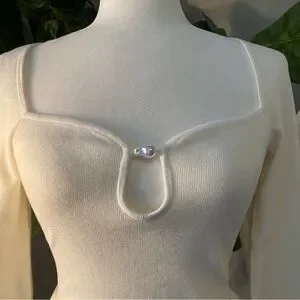 Short, fitted sweater in a fine knit featuring a sweetheart neckline with a cut-out section and a pearly plastic bead at the front. Concealed silicone trim at the top to keep it in place.