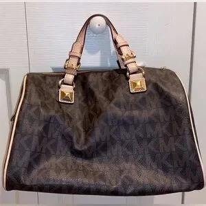Chic and timeless Michael Kors Grayson Medium Satchel in the classic brown signature MK logo print with gold-tone hardware. Features durable coated canvas, smooth beige leather trim, and rolled top handles with pyramid studs. Includes a top zip closure, spacious interior with MK monogram lining, zip and slip pockets, and the signature hanging MK medallion charm.