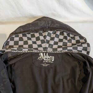 Vintage RARE Abbey Dawn by Avril Lavigne black skull jacket in small. Excellent used condition. No fading, stains, rips, holes or tears. The Abbey Dawn line of clothing is designed by Avril Lavigne herself. She wanted unique clothing to wear that she was unable to find in stores. Amazing skull print lightweight jacket with asymmetrical front zip closure. Grey and black checkerboard lining inside of hood. Big side pockets and awesome sparkly skull zipper pull. This jacket can be worn fully zipped closed, or all the way open, or half open with decorative skulls showing on the collar. Truly a rare, unique, vintage piece. The hood drawstring is not present. Please see all pictures, which are of the actual jacket. Pet free, smoke free household. Approximate measurements are below, plea let me know if you have any questions, thanks for looking!