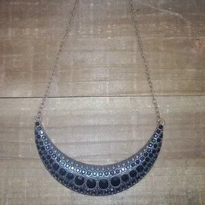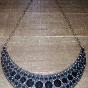 Varying in size, row after row of glittery black rhinestones are encrusted along the front of a studded half moon copper frame, creating a glittery statement below the collar. Features an adjustable clasp closure.