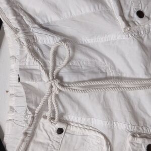 Elevate your summer wardrobe with these NWT Free People Moon Bay shorts in size M. These white parachute shorts feature cargo pockets, a high-rise fit, and an adjustable waist with elastic and drawstring closures. Made of 100% cotton poplin, they are lightweight, breathable, and easy to care for. Perfect for travel, outdoor activities, or casual wear, these shorts have a classic bohemian style. The button, strap, and buckle accents add a touch of personality, while the solid pattern and white color make them versatile for any occasion. Whether you're walking, beaching, or skateboarding, these shorts are a comfortable and stylish choice for the summer season.