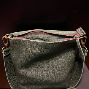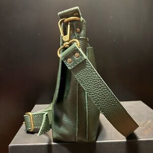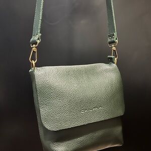 Beautifully made brand new purse with forest green pebbled leather and dust bag. Unlined flap and zipper enclosure. Adjustable strap with a buckle for crossbody or shoulder bag use.